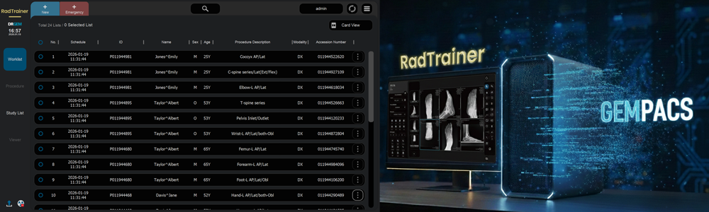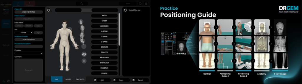 There is a growing demand for ‘pre-clinical training’ in radiology education that cultivates practical skills for immediate clinical use in hospital settings. In response to this need, DRGEM is proud to introduce ‘RadTrainer’, an optimized solution for bridging the gap between theory and clinical practice. RadTrainer uses a large educational library based on real data to provide students with a safe, radiation-free environment. In addition, RadTrainer offers instructors a workflow that is identical to that in real general hospitals.