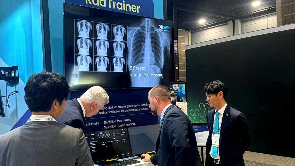 位于南厅 Lv3 的 DRGEM 展台吸引了络绎不绝的参观者。他们渴望亲身体验 DRGEM 的新一代成像解决方案。其中的亮点是 RAYMO 和 RadTrainer,这两款产品都吸引了参观者的强烈关注和积极反馈。.